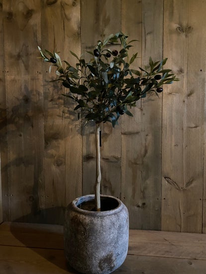 De olijfboompjes worden geleverd met een zwarte kunststofpot, niet met de stenen pot op de afbeelding