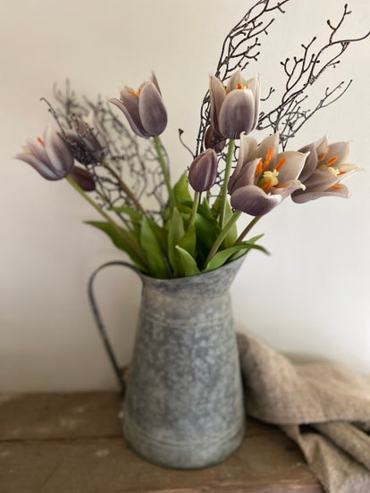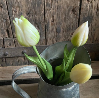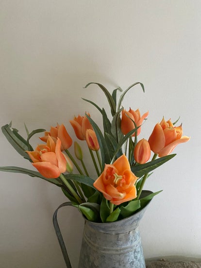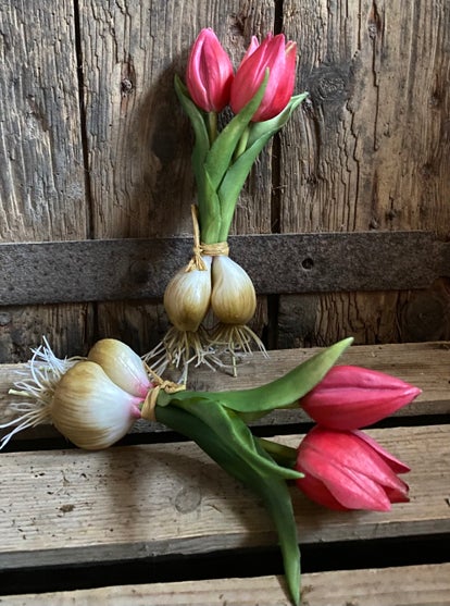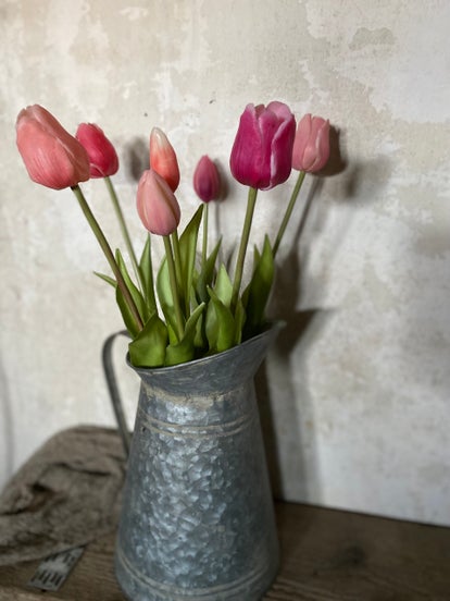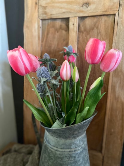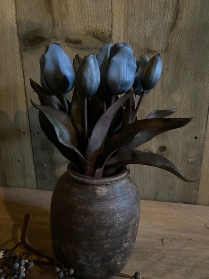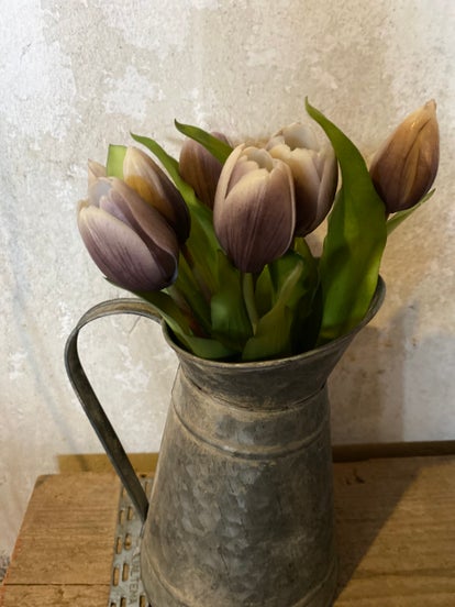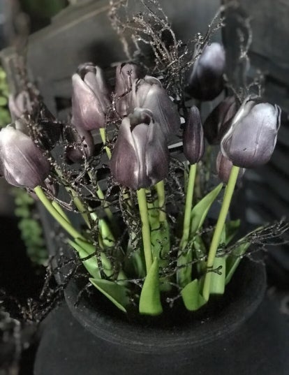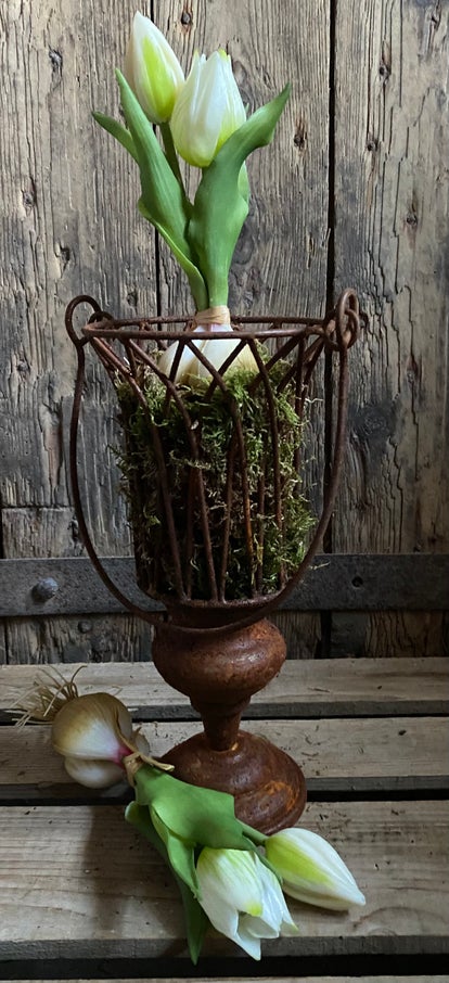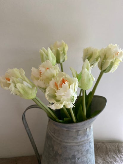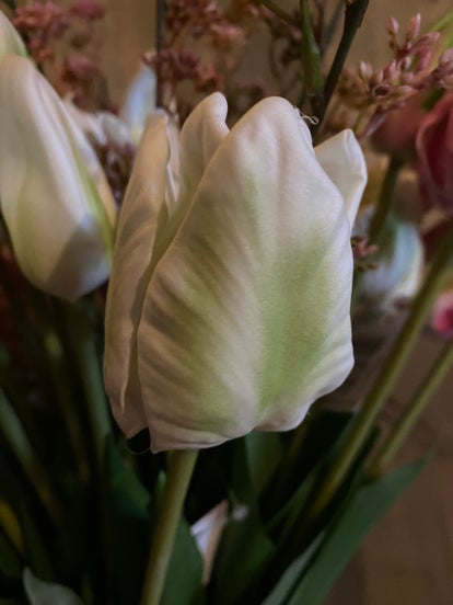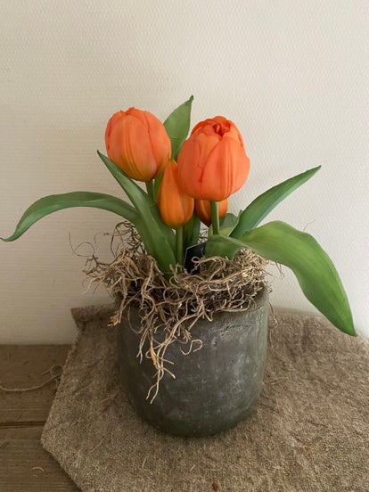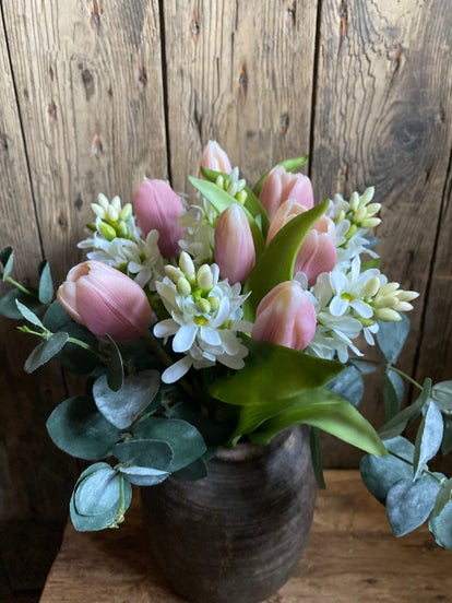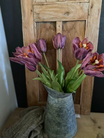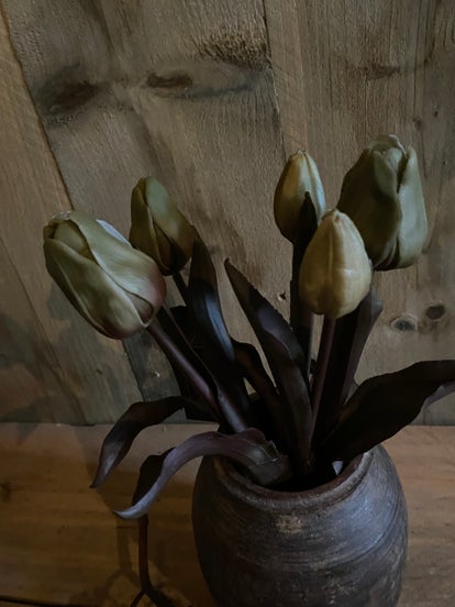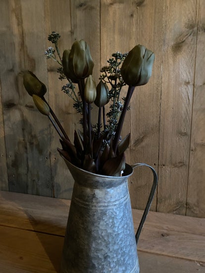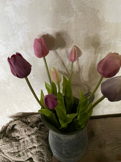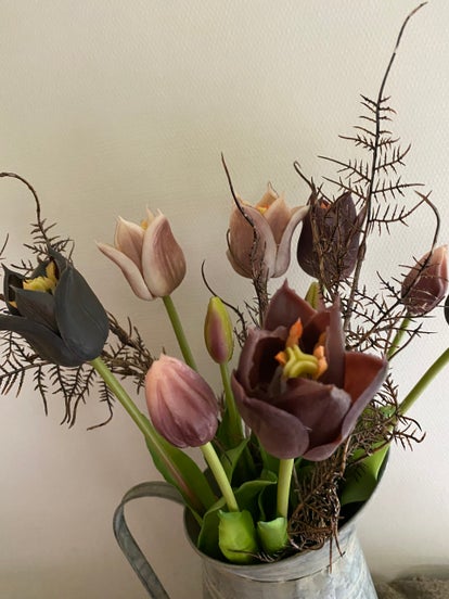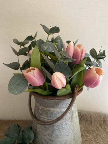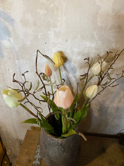Prachtig tussen de tulpen van 30 cm en wat eucalyptus.