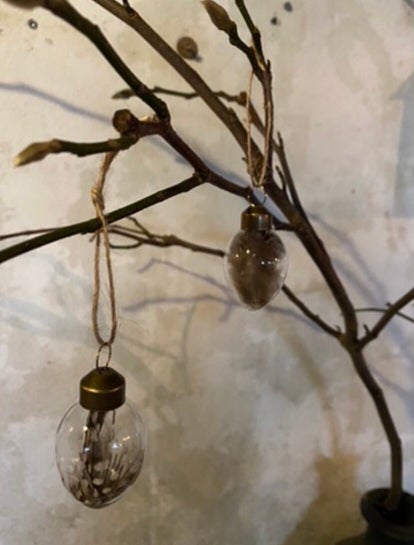 Doosje met 9 glazen eitjes gevuld met droogbloemetjes.