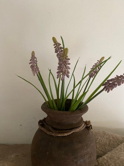 In de pot zitten twee bosjes met twee takken paarse distels.