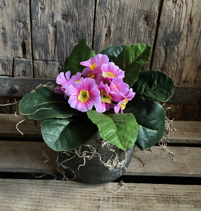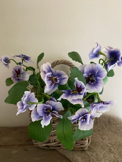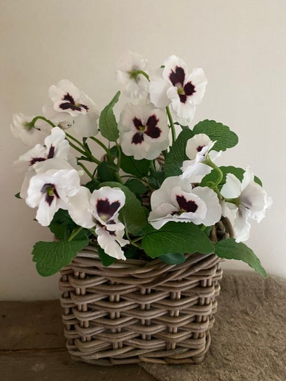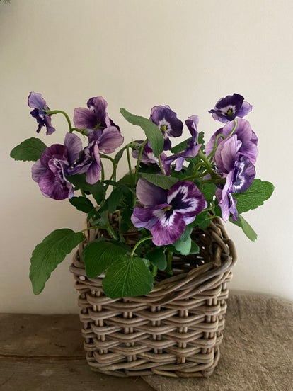 Set van drie takjes viooltjes plus een rotan hangmandje voor €22