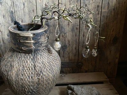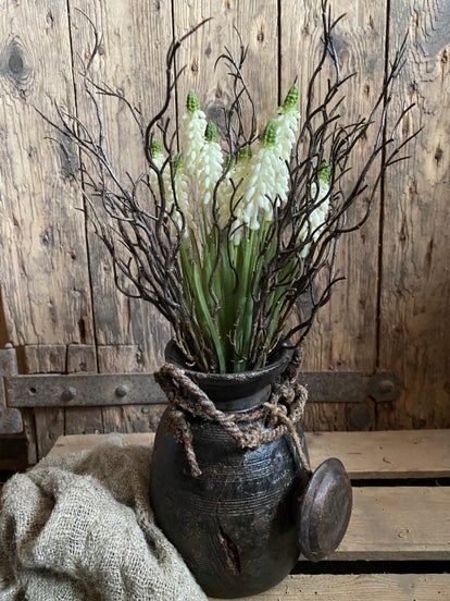 In de pot zitten twee bosjes met twee takken zwart/bruine takken