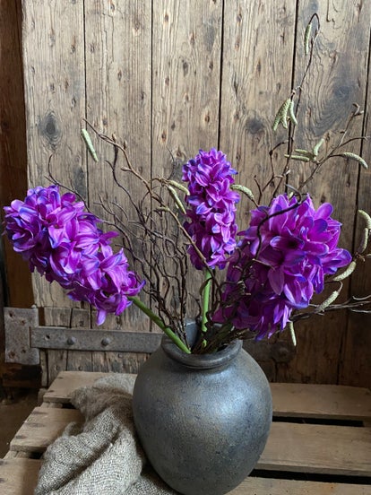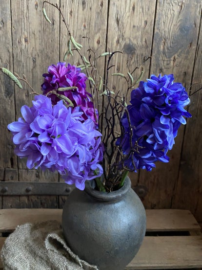 bosje van drie hyacinten, in de kleur donkerpaars/blauw, paars en hard roze